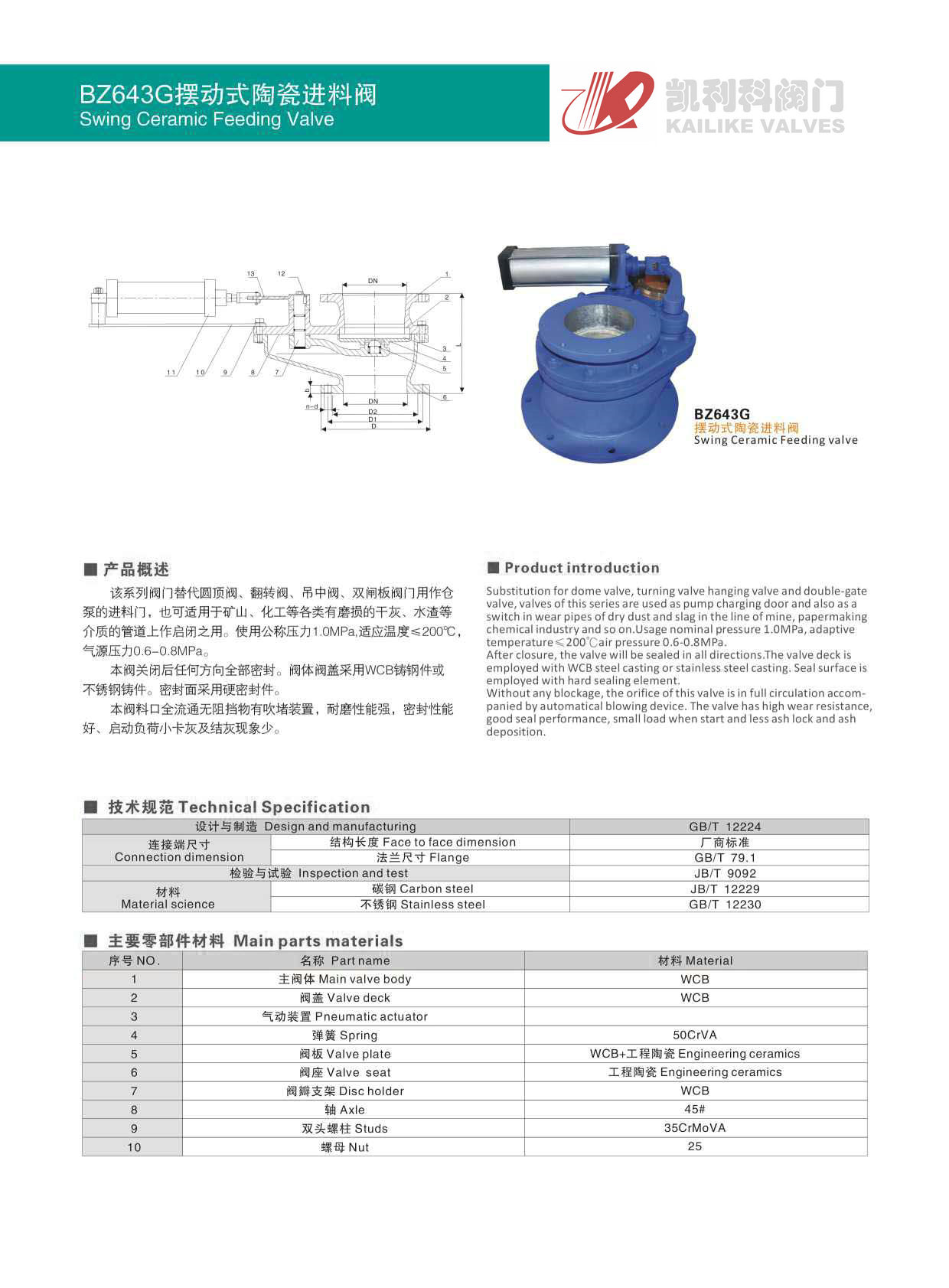 3、BZ643G擺動式陶瓷進料閥料口全流通無阻擋物有吹堵裝置,耐磨性能強,密封性能好、啟動負荷小卡灰及結灰現象少。